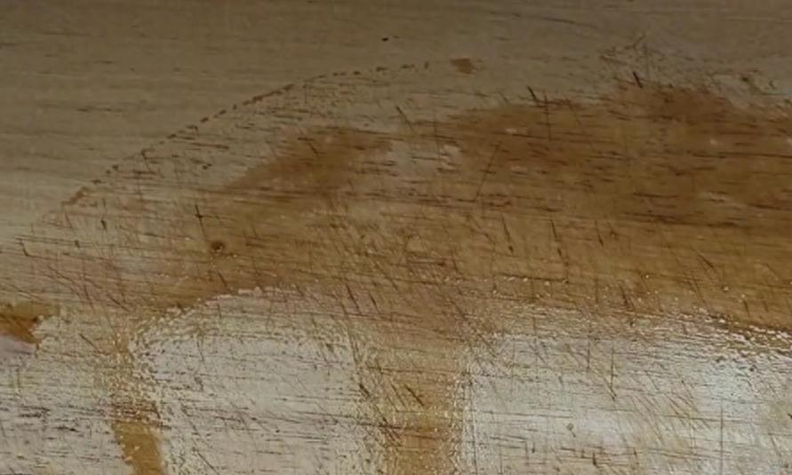 – Nhỏ 2–3 giọt nước rửa chén lên, rồi dùng bàn chải chà mạnh theo chiều vân gỗ